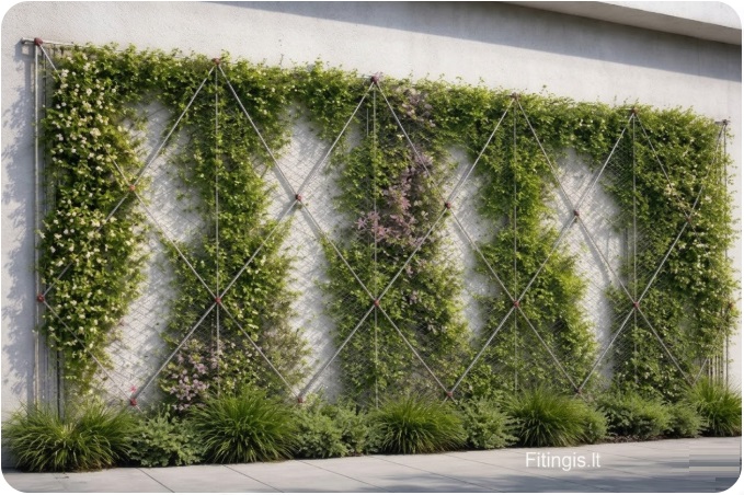 Sukurkite „gyvąją sieną“ savo namų eksterjere! Ši moderni nerūdijančio plieno trosų sistema yra skirta vertikaliam vijoklinių augalų auginimui ant betoninių, mūrinių ar kitų kietų paviršių. Tai ne tik atrama augalams, bet ir stilingas architektūrinis elementas, suteikiantis pastatui gyvybės ir privatumo.